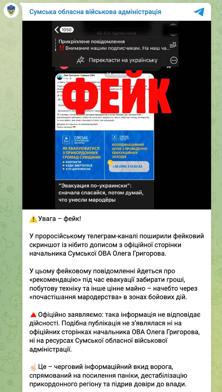 "Официально заявляем: такая информация не соответствует действительности. Подобная публикация не появлялась ни на официальных страницах начальника ОГА Олега Григорова, ни на ресурсах Сумской областной военной администрации. Это очередной информационный вброс врага, направленный на усиление паники, дестабилизацию приграничного региона и подрыв доверия к власти", - говорится в сообщении ОВА.