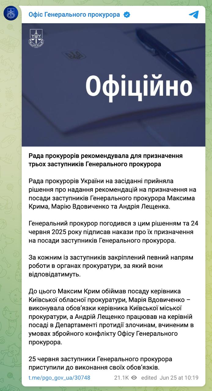 Совет прокуроров Украины на своем заседании принял решение о предоставлении рекомендаций на назначение на должности заместителей генерального прокурора Максима Крыма, Марии Вдовиченко и Андрея Лещенко.