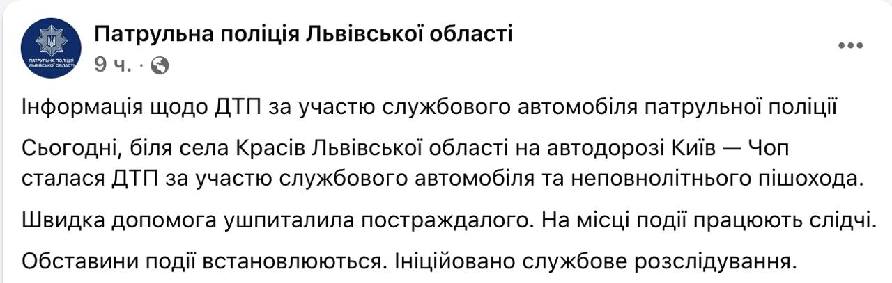 "Сегодня, возле села Красов Львовской области на автодороге Киев - Чоп произошло ДТП с участием служебного автомобиля и несовершеннолетнего пешехода. Скорая помощь госпитализировала пострадавшего. На месте происшествия работают следователи", - говорится в сообщении.