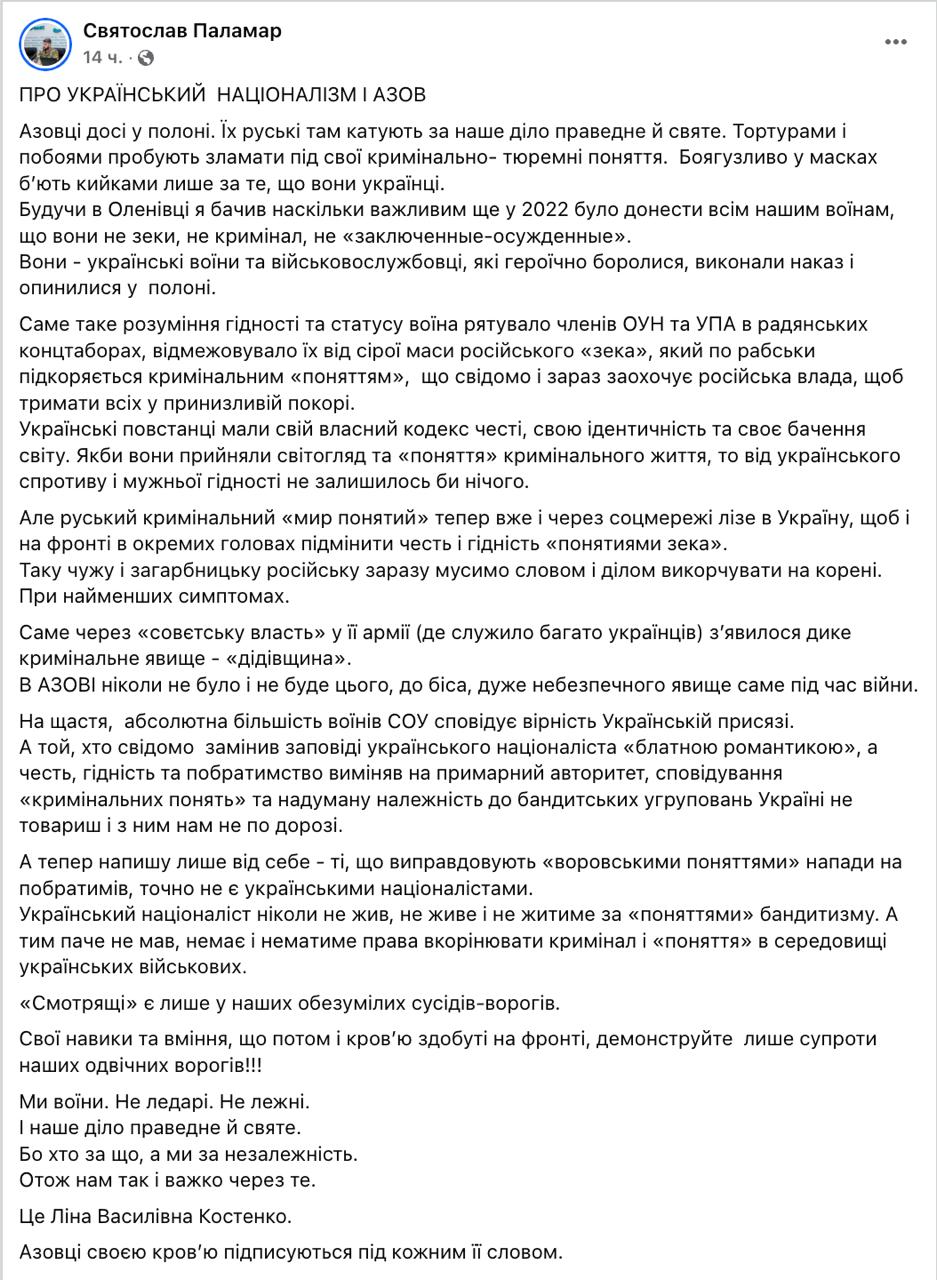 Замкомандира бригады Нацгвардии "Азов" Святослав Паламар заявил, что происходит нападения на его побратимов, которые оправдывают "воровскими понятиями".