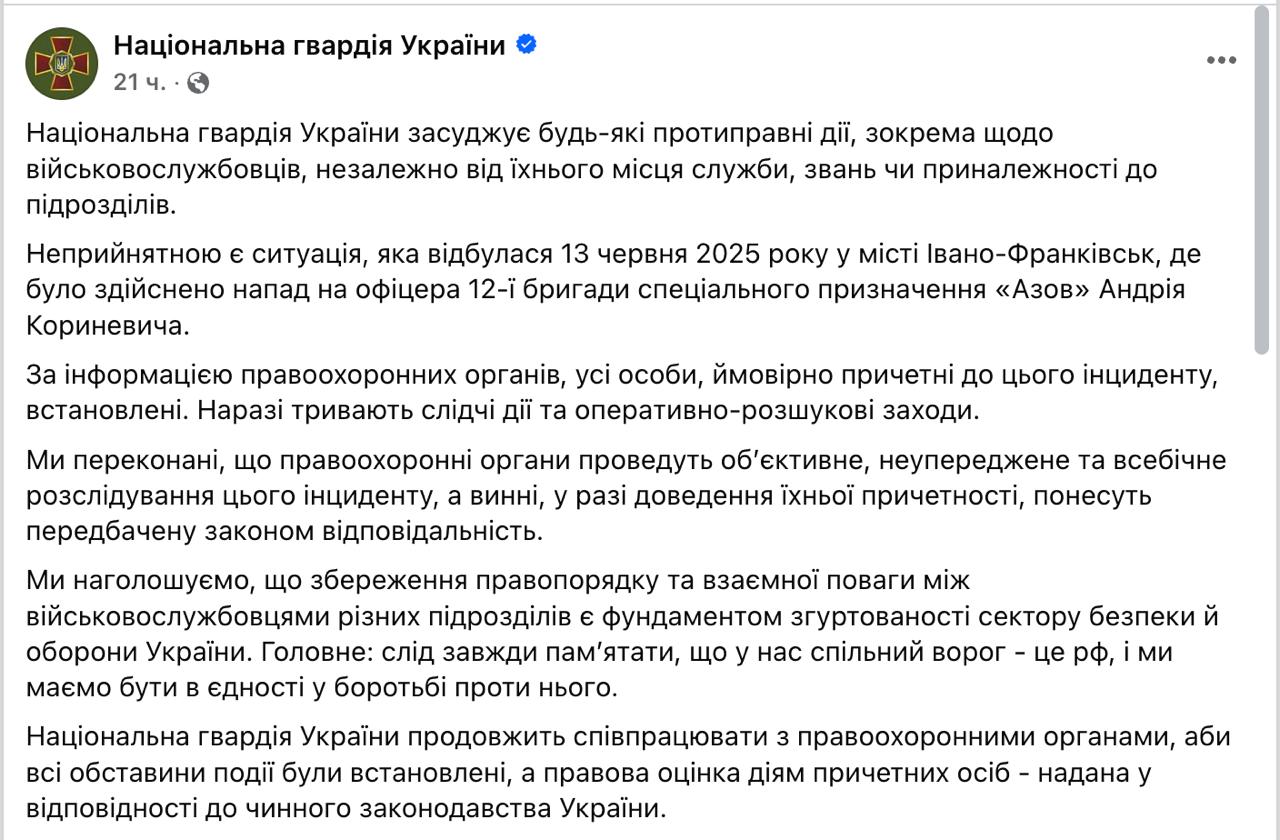 Национальная гвардия осудила избиение майора "Азова" Андрея Кориневича и призвала задержать подозреваемых.