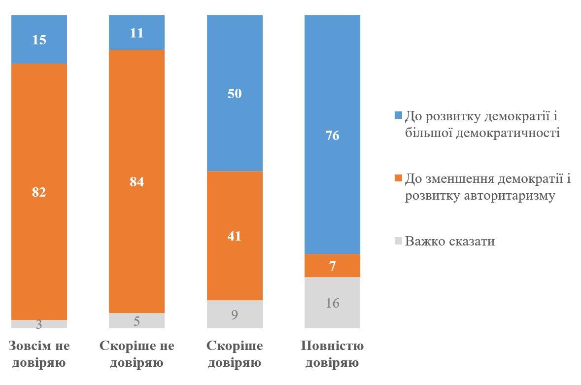 Среди тех, кто полностью доверяет Зеленскому, 76% говорят о движении к демократии и только 7% - к авторитаризму.