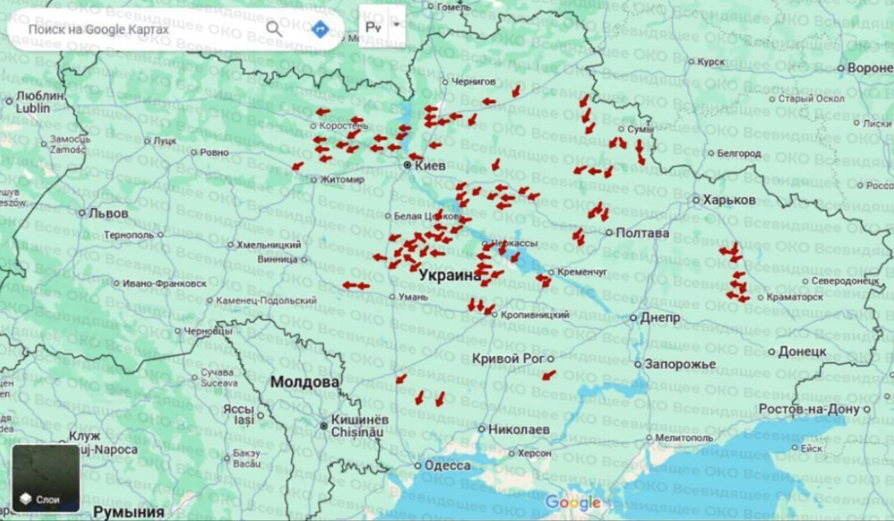 23:34 Карта налёта беспилотников по Украине.
