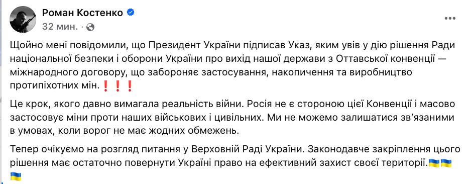 "Это шаг, давно требовавшийся реальностью войны. Россия не является стороной настоящей Конвенции и массово применяет мины против наших военных и гражданских. Мы не можем оставаться связанными в условиях, когда у врага нет никаких ограничений. Теперь ожидаем рассмотрения вопроса в Верховной Раде Украины. Законодательное закрепление этого решения должно окончательно вернуть Украине право на эффективную защиту своей территории", - написал нардеп.