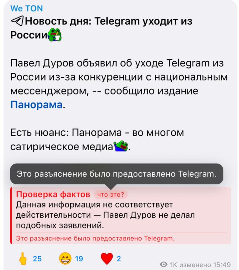 По их данным, поводом для нововведения стала ложная новость от канала We TON о якобы уходе Telegram из России, со ссылкой на сатирическое издание "Панорама".
