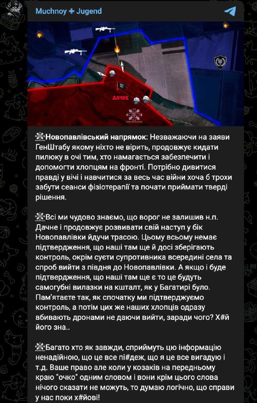 Мучной утверждает, что на данный момент нет достоверных подтверждений присутствия украинских сил в Дачном. Но наблюдается активность российских войск внутри населенного пункта и их попытки выйти к Новопавловке с юга.