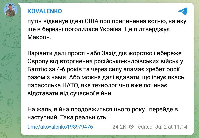 Он пишет, что "Путин отверг идею США о прекращении огня", и, "к сожалению, война продолжится в этом году и перейдет в следующий".