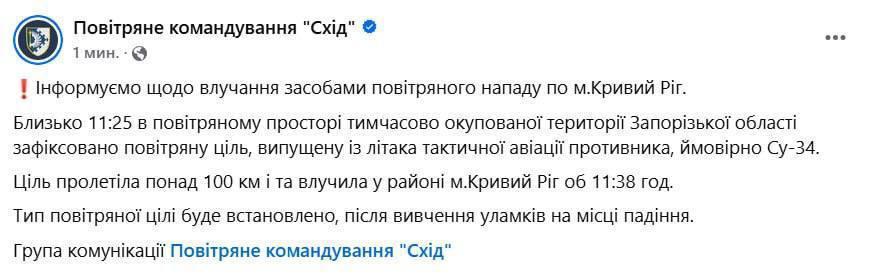 16.14 Вилкул подтвердил, что по Кривому Рогу россияне могли сегодня ударить не КАБ, а новой ракетой "Гром-1е". Это гибрид между управляемой бомбой и ракетой, которым ранее уже атаковали Днепр.