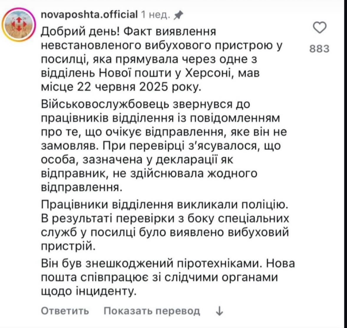 По ее информации, инцидент произошел 22 июня в Херсоне: военный обратился к сотрудником "Новой почты" и сказал, что ему пришло  уведомление о посылке, которую он не ждал. При проверке выяснилось, что указанный в данных отправитель тоже ничего не отправлял. Полиция и спецслужбы при обследовании посылки установили, что в ней находилась взрывчатка. Ее уничтожили пиротехники.