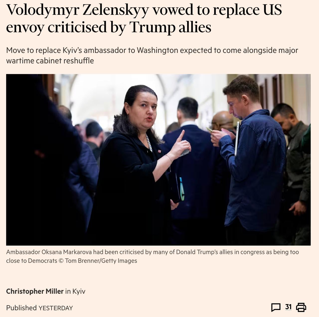 По их данным, Владимир Зеленский пообещал президенту США Дональду Трампу заменить посла Оксану Маркарову, которую республиканцы критикуют за близость к Демократической партии. Президенты договорились, что их команды отдельно обсудят кандидатов ей на замену. Зеленский рассчитывает назначить послом "умеющего заключать сделки человека", который "будет понятен Белому дому и в то же время конгрессу", заявил высокопоставленный украинский чиновник газете.