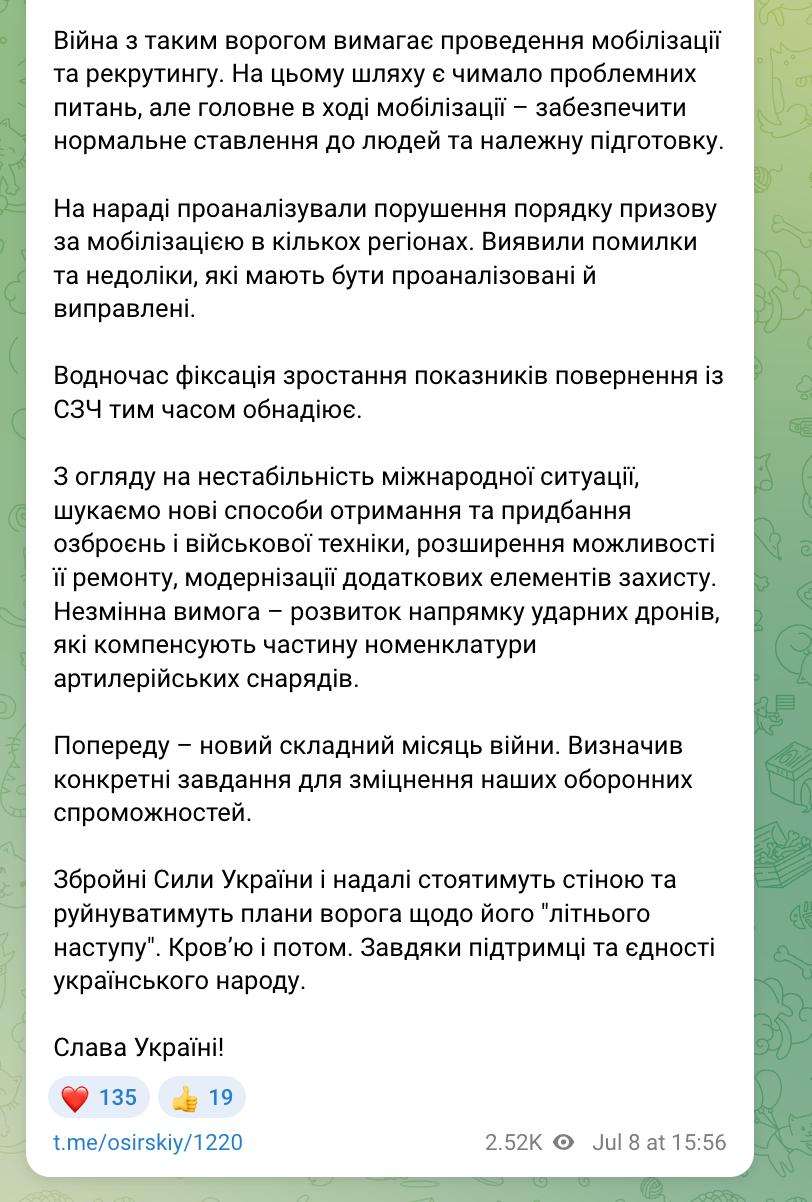 "Противник последовательно увеличивает количество личного состава, наращивает производство ракет и дронов. Война с таким врагом требует проведения мобилизации и рекрутинга. На этом пути есть немало проблемных вопросов, но главное в ходе мобилизации – обеспечить нормальное отношение к людям и надлежащую подготовку. На совещании проанализировали нарушения порядка призыва по мобилизации в нескольких регионах. Выявили ошибки и недостатки, которые должны быть проанализированы и исправлены", - рассказал главком.
