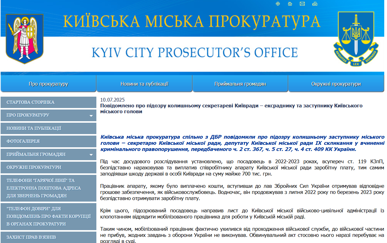 По версии следствия, подозреваемый в 2022-2023 годах безосновательно начислил почти 700 тыс. грн зарплаты сотруднику аппарата Киевского горсовета, который мобилизовался в ВСУ, но получал две зарплаты. При этом помог ему устроиться на работу обратно в горсовет, фактически способствуя уклонению от службы.