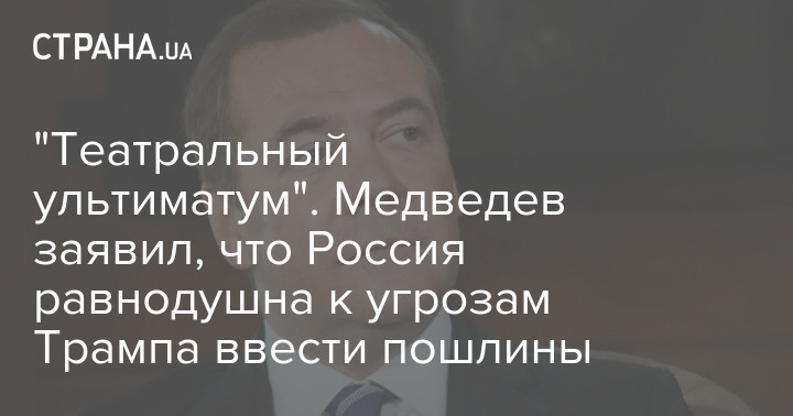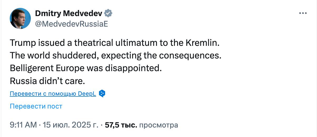 "Трамп выдвинул театральный ультиматум Кремлю. Мир замер в ожидании последствий. Воинственная Европа была разочарована. Россия осталась равнодушной", - написал Медведев.