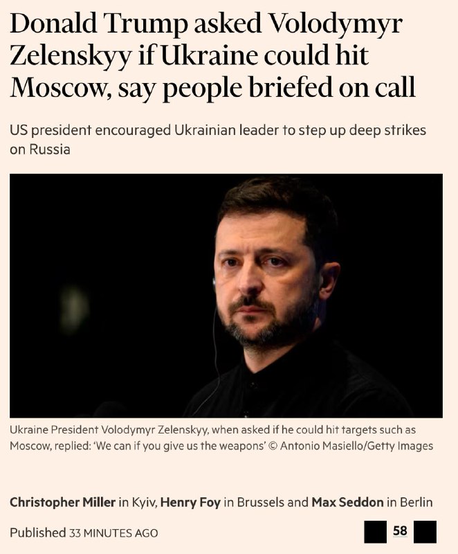 По словам источников газеты, Трамп дал понять Киеву, что поддерживает эту идею, описывая стратегию как направленную на то, чтобы "заставить их [россиян] почувствовать боль" и принудить Кремль сесть за стол переговоров. Западный чиновник также рассказал изданию, что и в Европе, и в США растет желание поставлять Украине дальнобойное оружие, способное "принести войну москвичам".