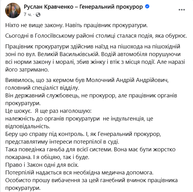В Киеве сотрудник органов прокуратуры сбил женщину в пешеходной зоне и скрылся. Генпрокурор отреагировал