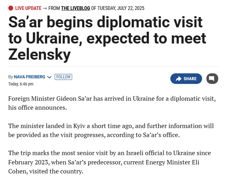 Издание отмечает, что Саар стал самым высокопоставленным израильским политиком, посетившим Украину с февраля 2023 года, когда в страну приезжал его предшественник, а ныне министр энергетики Эли Коэн.