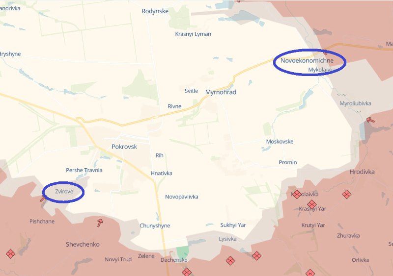 Новоэкономическое находится на восточных подступах к Мирнограду, а Зверево - к юго-западу от Покровска. На карте Deep State оба населенных пункта находятся в серой зоне.