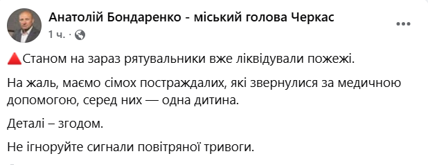 08:10 Ночью россияне нанесли ракетный удар по Черкассам. Семь пострадавших, которые обратились за медицинской помощью, в том числе один ребенок, сообщает мэр города Анатолий Бондаренко.