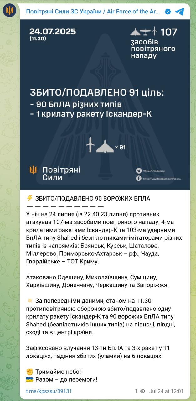 Из 103 дронов сбить\подавить удалось 90, из четырех "Искандеров" - один.
