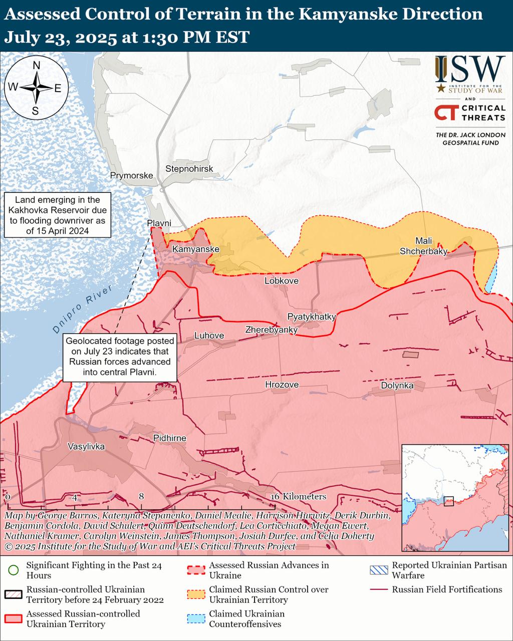 Американский "Институт изучения войны" вчера сообщал о продвижении россиян в центре Плавней, что северо-западнее Каменского, а также атаках в направлении Степногорска.