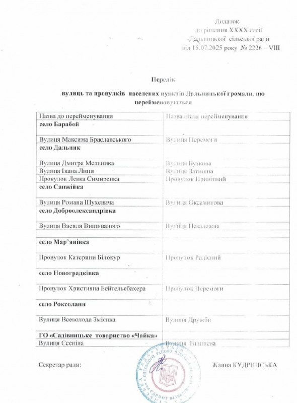 Как указано в дополнении к решению Дальницкой сельской общины, улица имени главкома УПА Романа Шухевича в селе Санжейка теперь будет называться Виноградной. А улицы, носившие имена деятелей УНР Ивана Липы и Всеволода Змиенко в селах Дальник и Роксоланы, получат имена Тихой и Дружбы.
