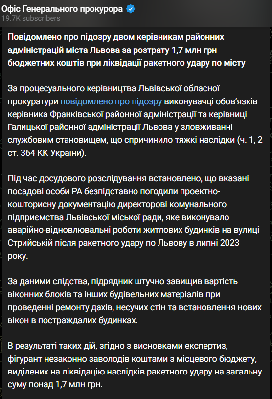 Офис генпрокурора сообщил о подозрении двум руководителям районных администраций Львова за растрату 1,7 млн грн бюджетных средств при ликвидации ракетного удара по городу.