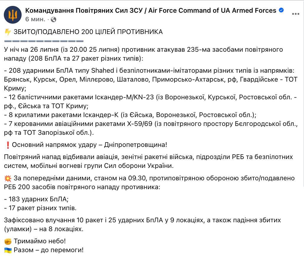 Всего за ночь силы ПВО сбили 7 ракет и 26 беспилотников в Днепре и области.