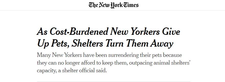 По данным организации Animal Care Centers of NYC (ACC), люди решают избавиться от животных из‑за финансового кризиса и последствий пандемии, во время которой резко упало число стерилизаций. Представитель организации Кейти Хансен добавила, что примерно треть животных были сданы в приюты после потери жилья их владельцами.