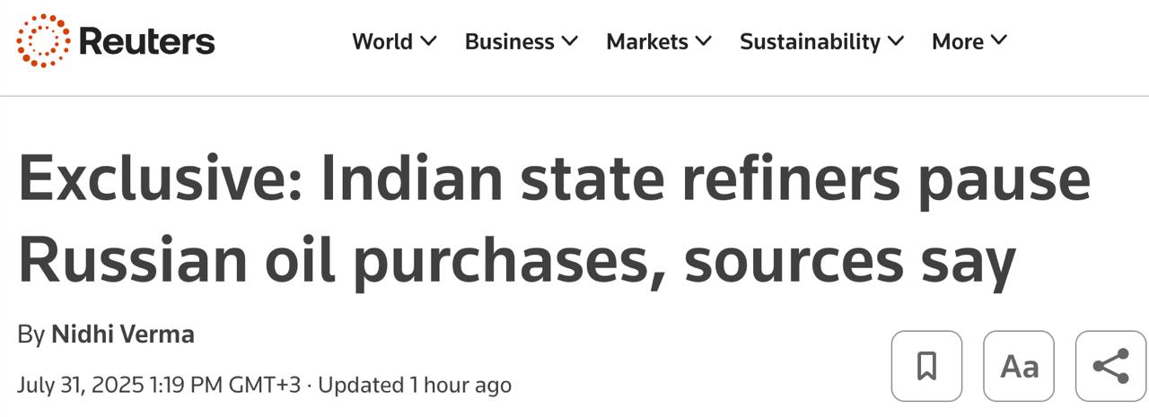 Индийские государственные нефтеперерабатывающие заводы прекратили закупку российской нефти. Причем это произошло еще на прошлой неделе. Причиной могут быть не только угрозы пошлин со стороны президента США Дональда Трампа, но и сокращение скидок в этом месяце.