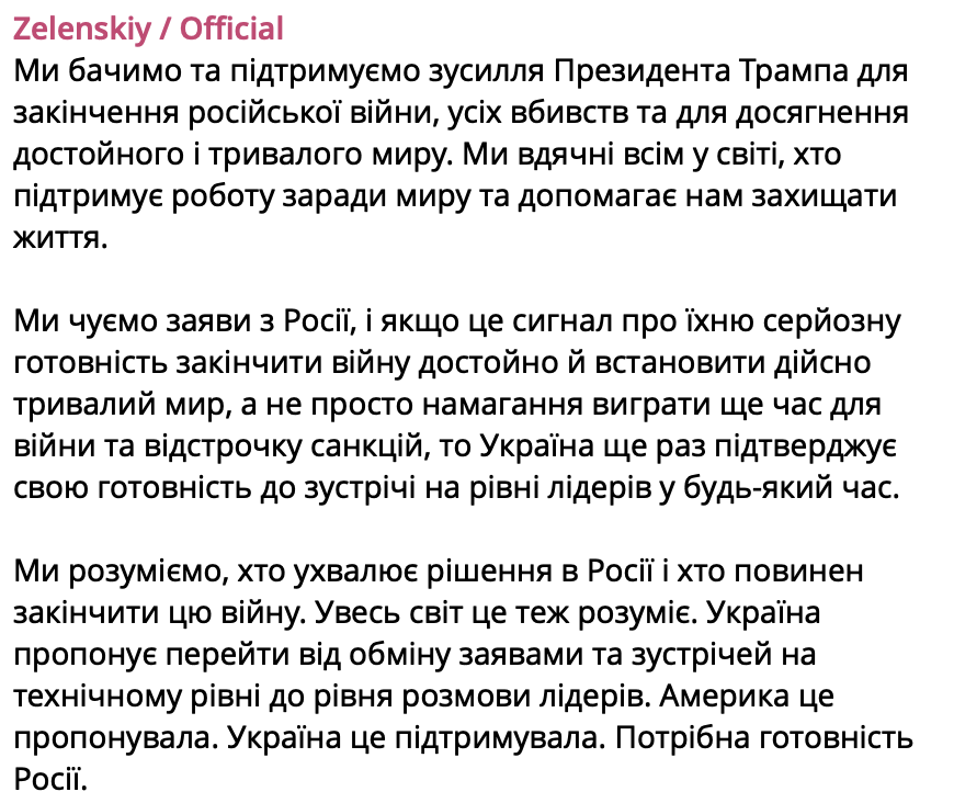 Мы понимаем, кто принимает решение в России и кто должен завершить эту войну. Весь мир это тоже понимает. Украина предлагает перейти от обмена заявлениями и встреч на техническом уровне к разговору лидеров. Америка это предлагала. Украина это поддерживала. Требуется готовность России", - написал Зеленский.