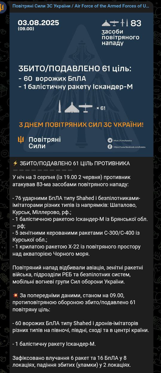 - "Шахедов" и дронов-имитаторов - 76 (сбито/подавлено 60);