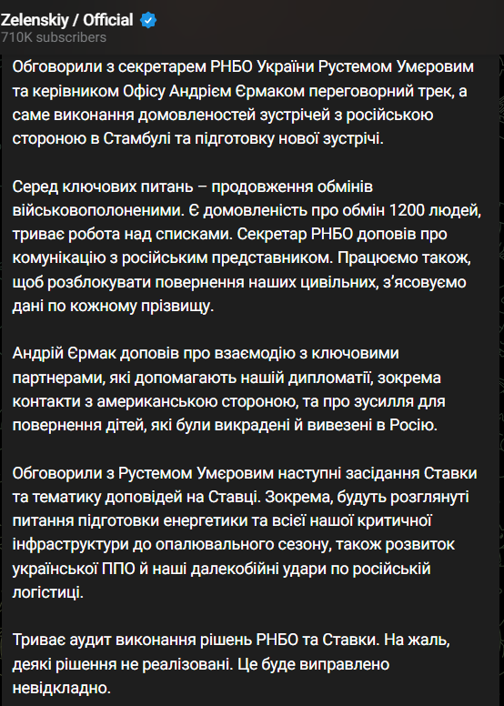 "Обсудили с секретарем СНБО Украины Рустемом Умеровым и руководителем Офиса Андреем Ермаком переговорный трек, а именно исполнение договоренностей встреч с российской стороной в Стамбуле и подготовку новой встречи", - написал он.
