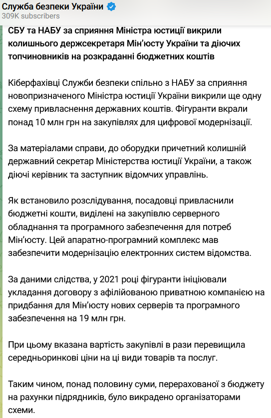 По версии следствия, в 2021 году сотрудники Минюста закупили оборудование через частную компанию по многократно завышенным ценам, заплатив за контракт 19 миллионов гривен и переплатив из них десять.