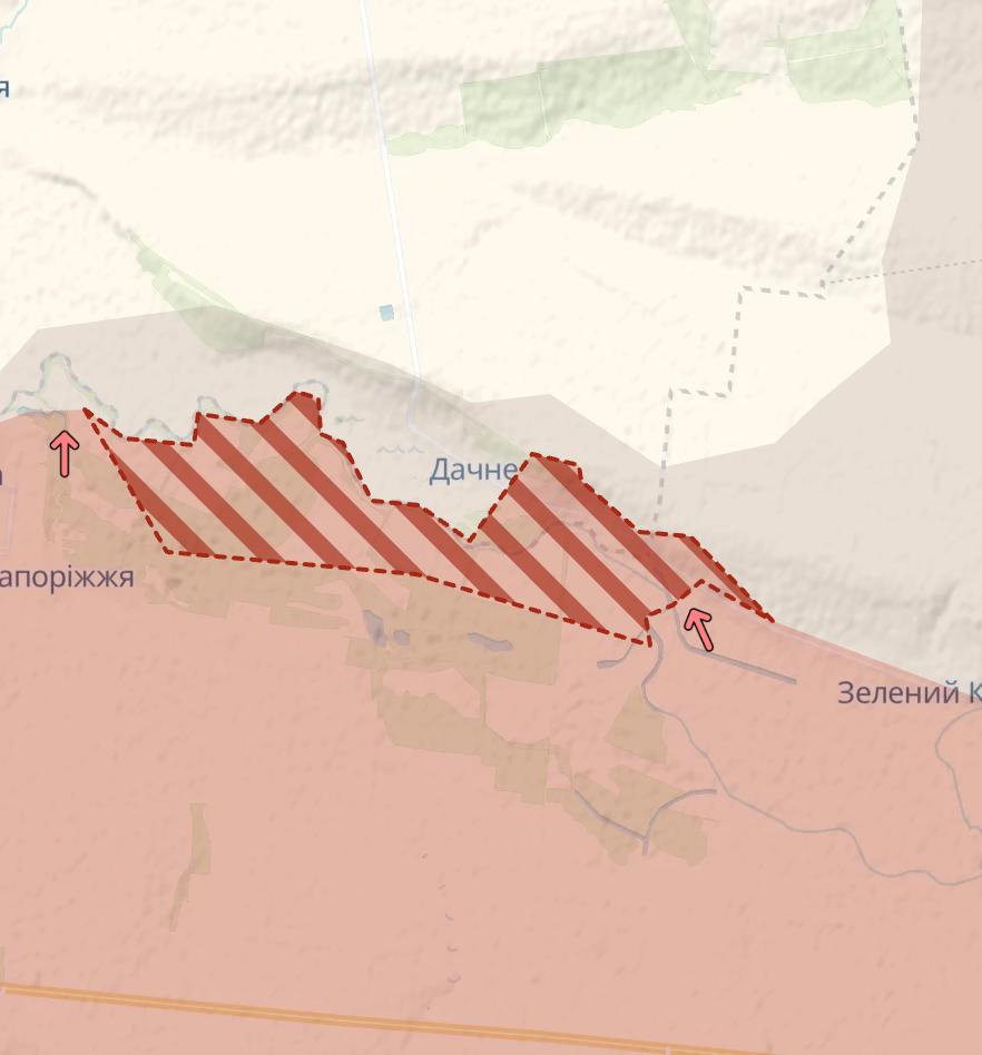 09:40 Армия РФ перебралась через реку Волчья и закрепилась на территории Днепропетровской области в районе Дачного, свидетельствует карта Deep State.