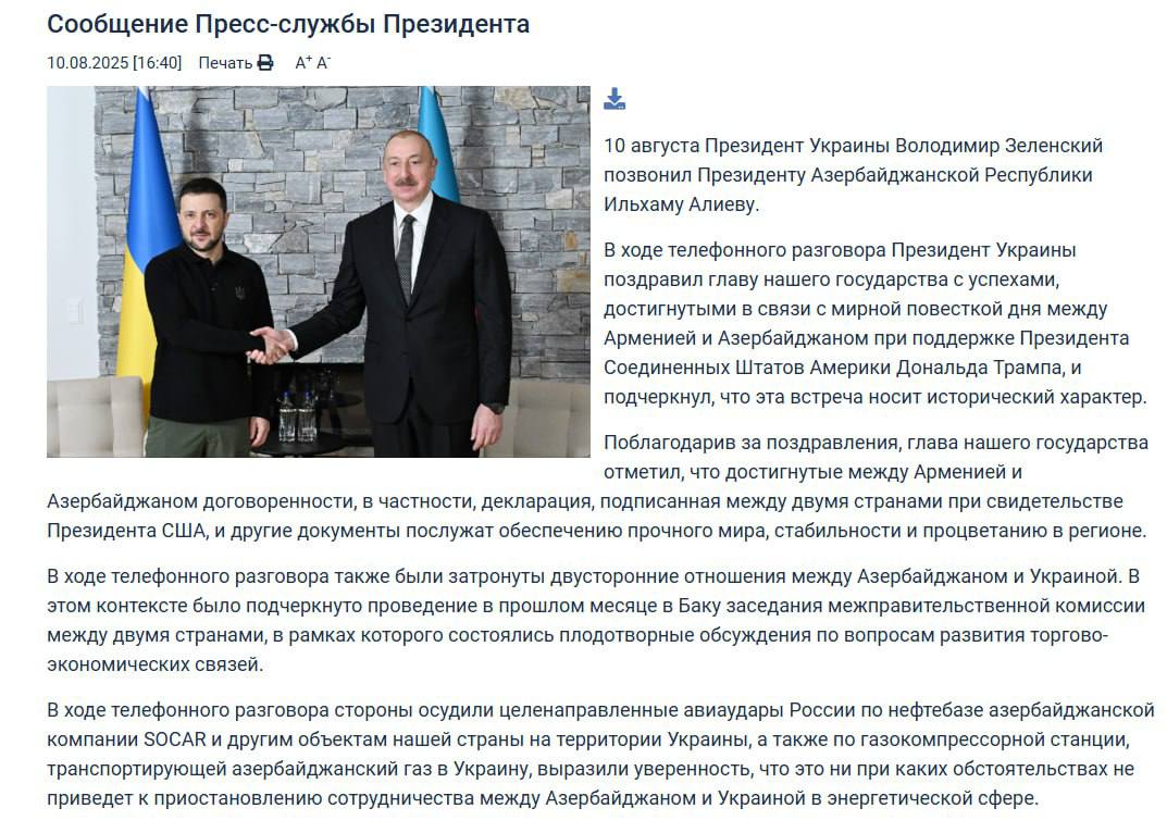 Зеленский в свою очередь поздравил Алиева с достигнутыми в Вашингтоне договоренностями с Арменией при посредничестве президента США Дональда Трампа.