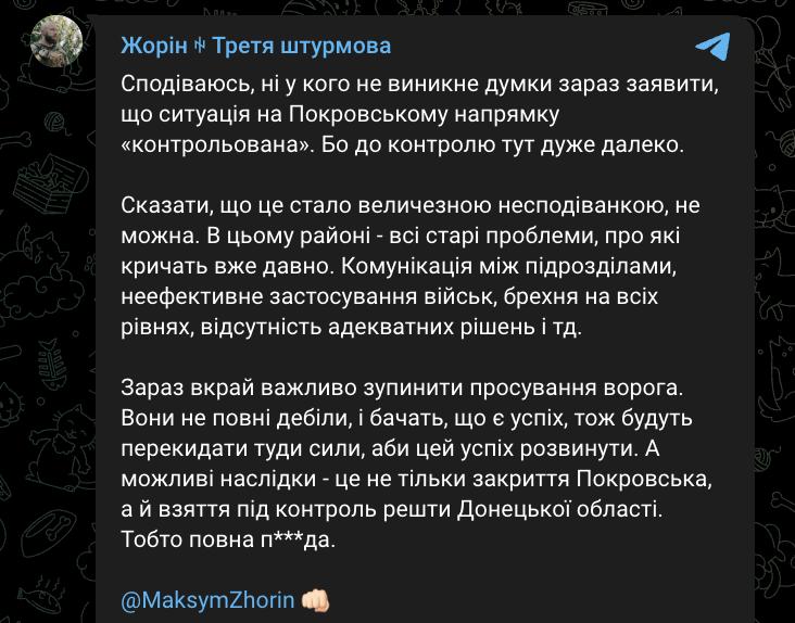 "Они (россияне - Ред.) не полные идиоты и видят, что есть успех, поэтому будут перебрасывать туда силы, чтобы этот успех развить. Возможные последствия - это не только блокирование Покровска, но и установление контроля над остальной частью Донецкой области. То есть полная п@@да", - добавил Жорин.