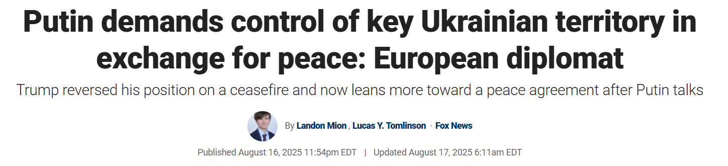 "После встречи с Путиным в пятницу на Аляске Трамп сообщил европейским союзникам, что российский президент вновь заявил о своей заинтересованности в ключевых Луганской и Донецкой областях, но при этом он, по всей видимости, открыт для возможности урегулирования тупиковой ситуации в Запорожье и Херсоне, а также замораживания напряженности вдоль линий фронта", - пишет издание.
