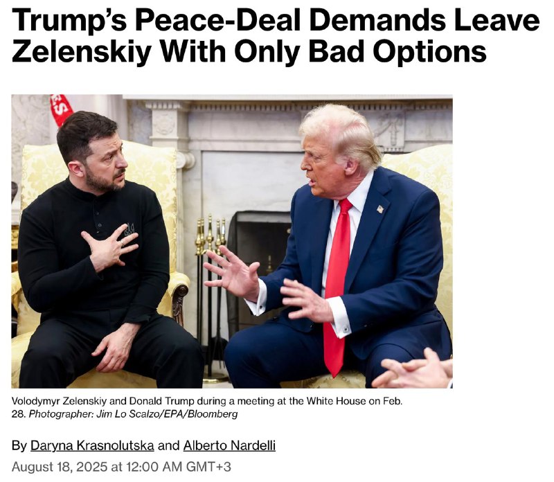 Bloomberg отмечает, что после саммита на Аляске, который не привел к прекращению огня, Трамп "практически не оставил Зеленскому пространства для манёвра".