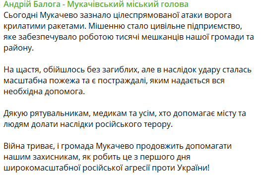 В Мукачево под ударом было гражданское предприятие, сообщил мэр Андрей Балога. В результате обстрела произошел масштабный пожар. ОВА сообщает об уничтожении складов и 12 пострадавших.