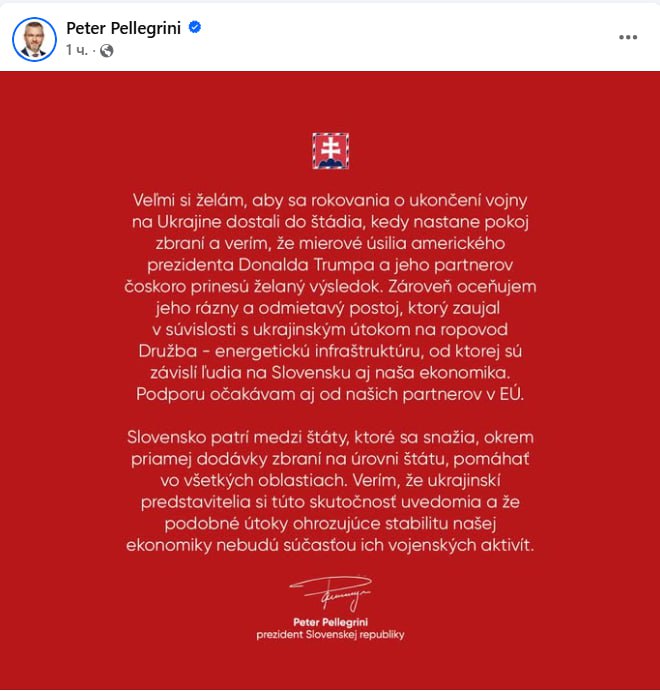 "Я ценю его твёрдую и негативную позицию, которую он занял в связи с украинским нападением на нефтепровод "Дружба" – энергетическую инфраструктуру, от которой зависят народ Словакии и наша экономика. Я также ожидаю поддержки от наших партнёров в ЕС... Я верю, что украинские власти осознают этот факт, и что подобные нападения, угрожающие стабильности нашей экономики, не будут частью их военной деятельности", – написал президент.