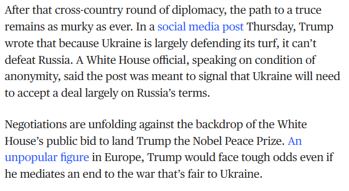 13:54 Ещё одно американское издание пишет, что недавний пост Трампа о том, что Украина, не атакуя Россию, победить в войне не может, является сигналом о том, что Украине придётся принять соглашение, в основном, на условиях России.