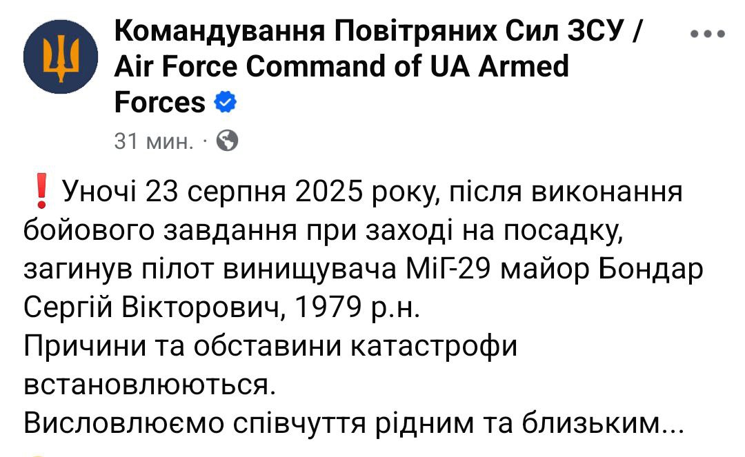 13:06 Разбившийся при посадке пилот МиГ-29, майор Сергей Бондарь, служил в 40 бригаде тактической авиации, известной как "Призрак Киева".