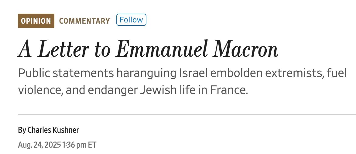 "В 81-ю годовщину освобождения Парижа союзниками, положившего конец депортации евреев с французской земли, я выражаю глубокую обеспокоенность резким ростом антисемитизма во Франции и отсутствием достаточных мер со стороны вашего правительства по противодействию ему. Во Франции не проходит и дня, чтобы евреи не подверглись нападениям на улицах, не были осквернены синагоги или школы или чтобы не были разгромлены принадлежащие евреям предприятия. Ваше Министерство внутренних дел сообщило об антисемитских инцидентах даже в детских садах. Публичные заявления, направленные против Израиля, и жесты в пользу признания палестинского государства поощряют экстремистов, разжигают насилие и ставят под угрозу жизнь евреев во Франции. В современном мире антисионизм — это антисемитизм, простой и понятный", - написал Кушнер.