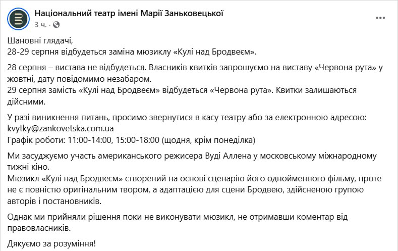 Об этом заявила пресс-служба Национального театра им. М. Заньковецкой на своей странице в Facebook.
