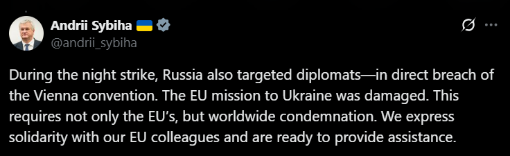 В результате сегодняшнего ночного удара РФ в Киеве повреждено здание миссии Европейского Союза. Об этом сообщает глава МИД Андрей Сибига в соцсети Х.