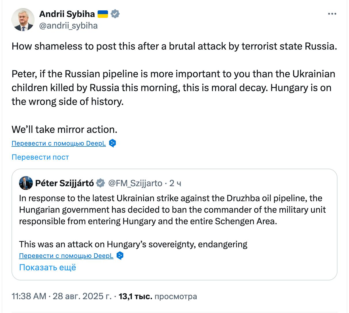 "Как бесстыдно публиковать это после жестокой атаки террористического государства Россия. Питер, если российский трубопровод для тебя важнее, чем украинские дети, убитые Россией этим утром, это моральное разложение. Венгрия находится на неправильной стороне истории", - написал Сибига, ответив на пост венгерского коллеги.