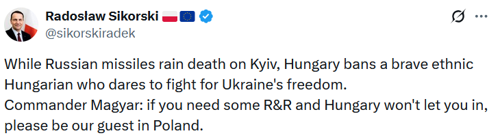 "Командир Мадьяр, если вам нужен отдых, и Венгрия не впускает вас, пожалуйста, приезжайте в Польшу", - написал Сикорский.