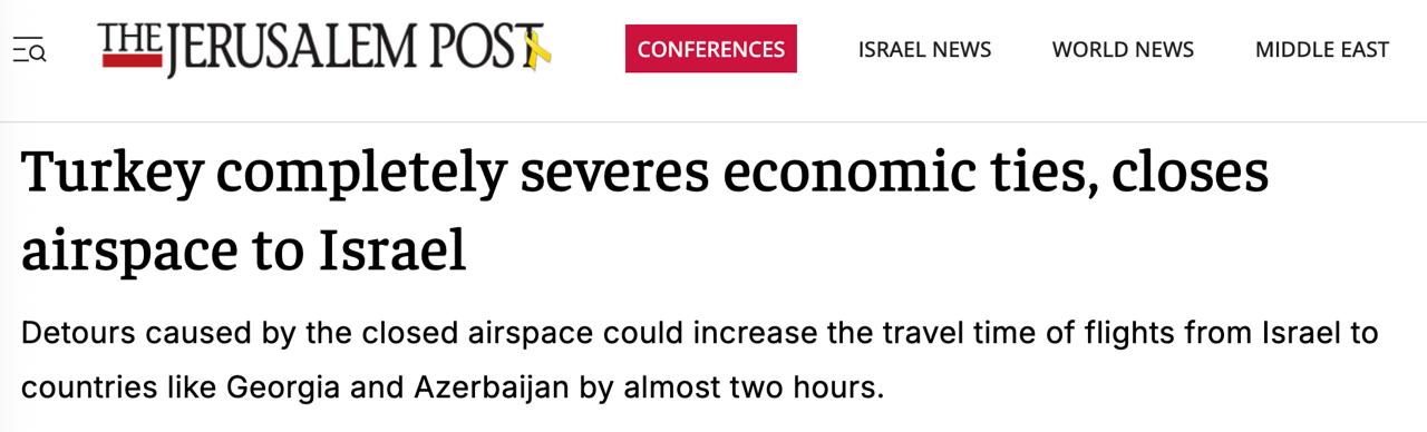 Турция закрыла небо для израильских самолетов и объявила о полном прекращении торговли с Израилем. Турецким судам запрещён вход в израильские порты.