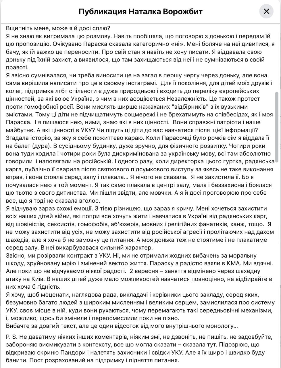 "На странице в Инстаграме Параски (которой она последний раз пользовалась в 2024 году и на которую подписаны все ее родственники), они нашли эмодзи – флажок ЛГБТ. Еще там есть флаг Украины и четыре фото – два с котом и два селфи. Следовательно, этот флажок, который для нее означает толерантность и человечность, демократичность, принятие мира в его разных красках, стал причиной отказа на проживание в коллегиуме, который не является монастырем или сектой, а относится к учебному заведению", - пишет Ворожбит.
