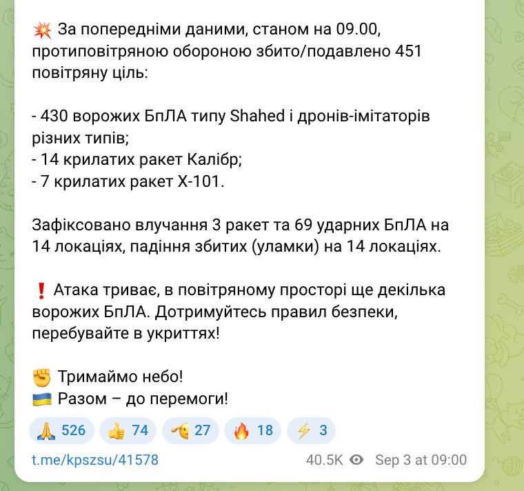 В Воздушных силах ВСУ сообщили, что Украину ночью атаковали 502 БПЛА и 24 крылатые ракеты, было 72 прилета. Сбить удалось 451 дрон ("Шахеды" и имитаторы) и 21 ракету.